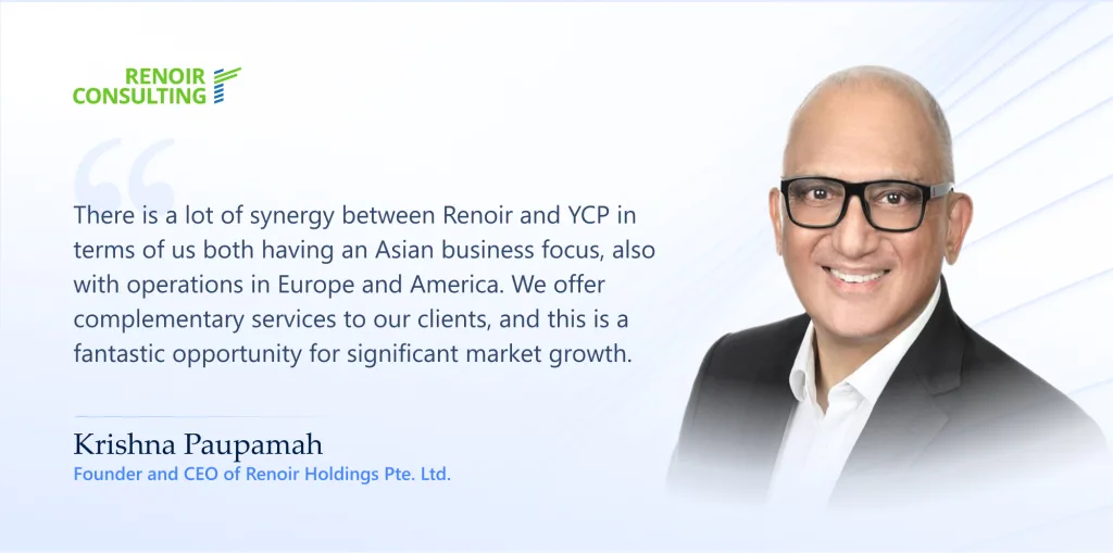 “Established in 1994, Renoir Consulting is a world leader in operational improvement and implementation consulting. We have been independent for more than 30 years having proudly navigated our way through many challenging economic climates during that period,” says Krishna Paupamah, the founder and CEO of Renoir Holdings Pte. Ltd. “Following that long period of independence I am excited that Renoir Consulting is now being strengthened through its acquisition by YCP Holdings. There is a lot of synergy between Renoir and YCP in terms of us both having an Asian business focus, also with operations in Europe and America. We offer complementary services to our clients, and this is a fantastic opportunity for significant market growth. We are a great fit for each other in terms of structure and culture, and I am looking forward to working as a newly integrated team that comes with many benefits for clients, stakeholders and employees. I look forward to celebrating many successes together as we move through the next phase of our journey and development.”